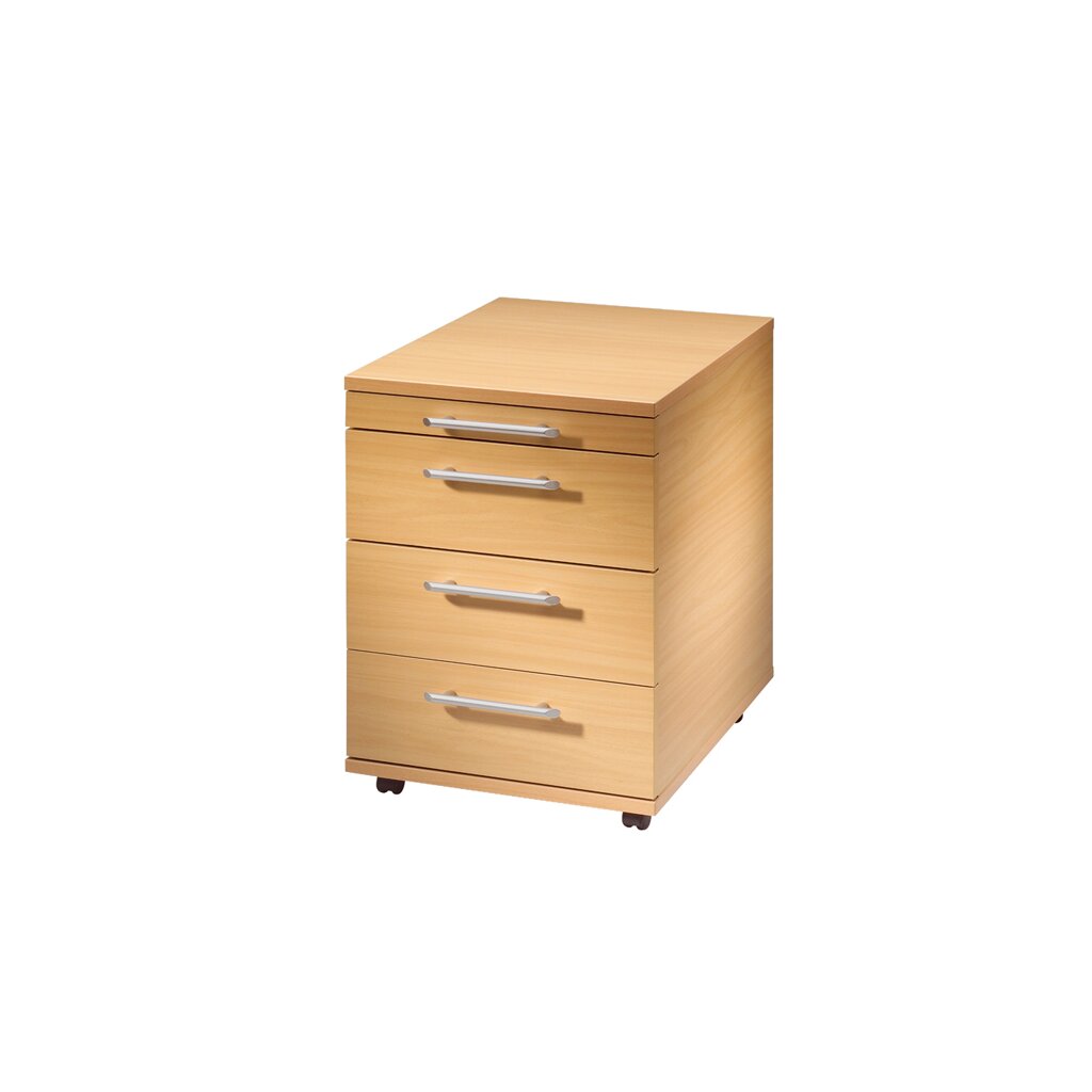 4 Schubladen (davon 1 Stiftablage) und 1 Hängeregisterauszug, Holzzargen auf Metallkugelführungen, Schublade lässt sich bis zu 80% ausziehen, Tragkraft der Schublade 8 kg, Hängeregistratur 12 kg, nicht abschließbar