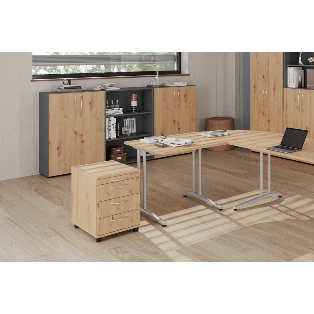 Rollcontainer mit 3 Schubladen, 1 x Utensilienfach, 58 cm Tief abschließbar Grau/ Grau