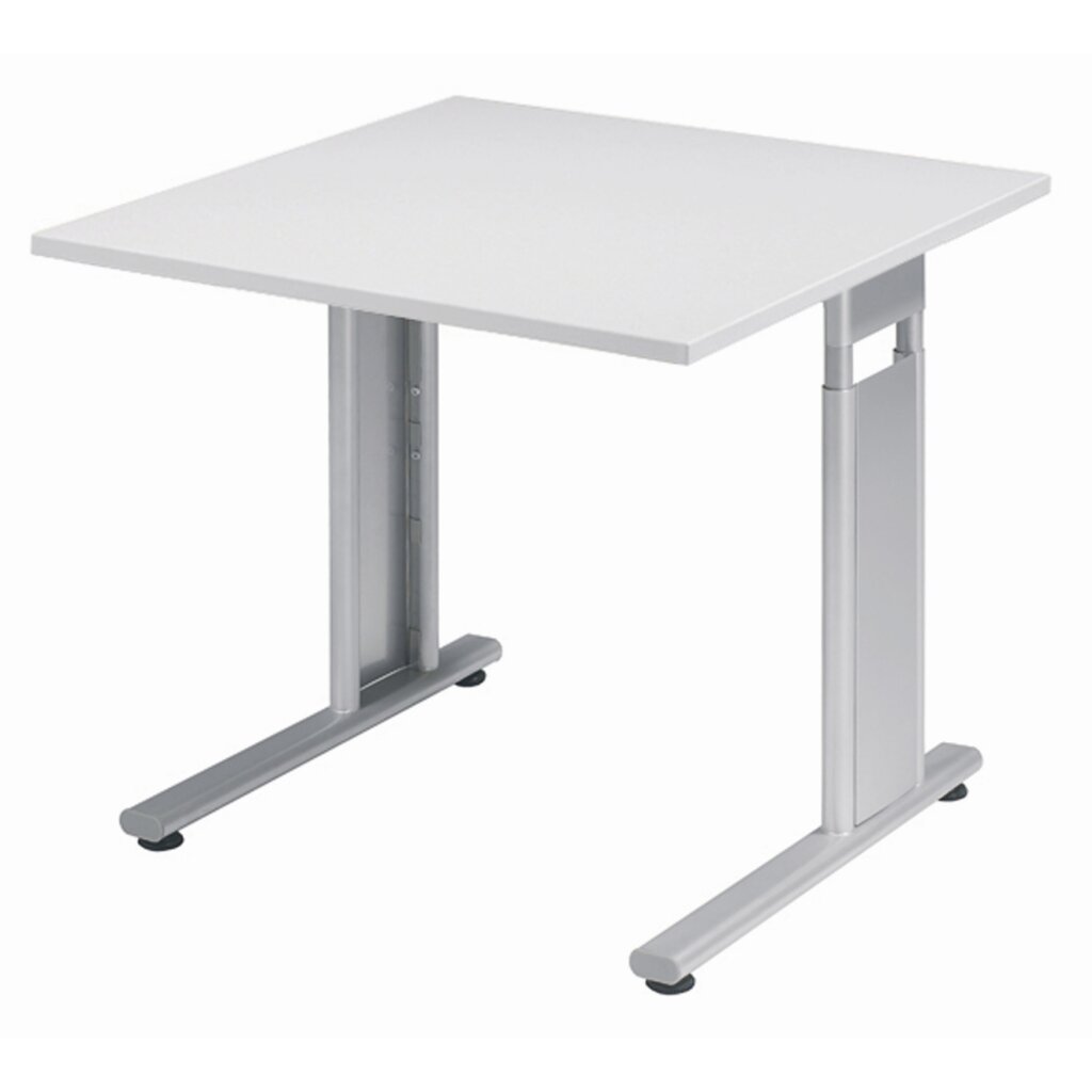 Das C-Fuß-Metallgestell sorgt mit 2 Säulen für hohe Stabilität, die Seitenblenden und der Kabelkanal sind bereits im Lieferumfang enthalten. Das komplette Gestell ist pulverbeschichtet in Silber. Der Tisch ist höhenverstellbar von 68-82cm durch eine Rohr-in-Rohr-Führung.