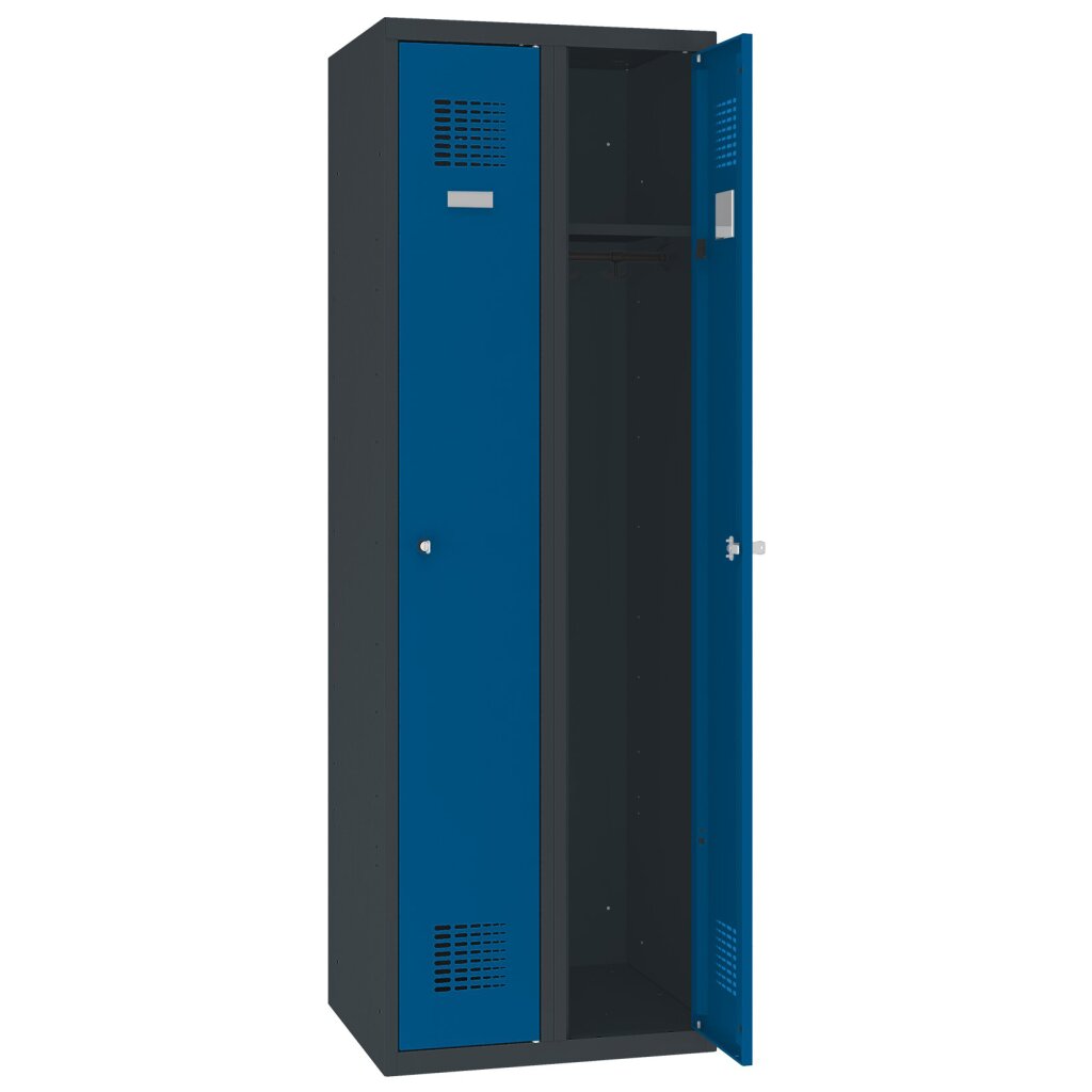 Modernes und überarbeitetes Design der Stahlspinde durch moderne und effektive Lüftungsschlitze sowie verkürzten Sockel für mehr Nutzfläche für die Schrankfächer. Der Sockel reicht dennoch aus um den Schrank bei der Bodenreinigung zu schützen.