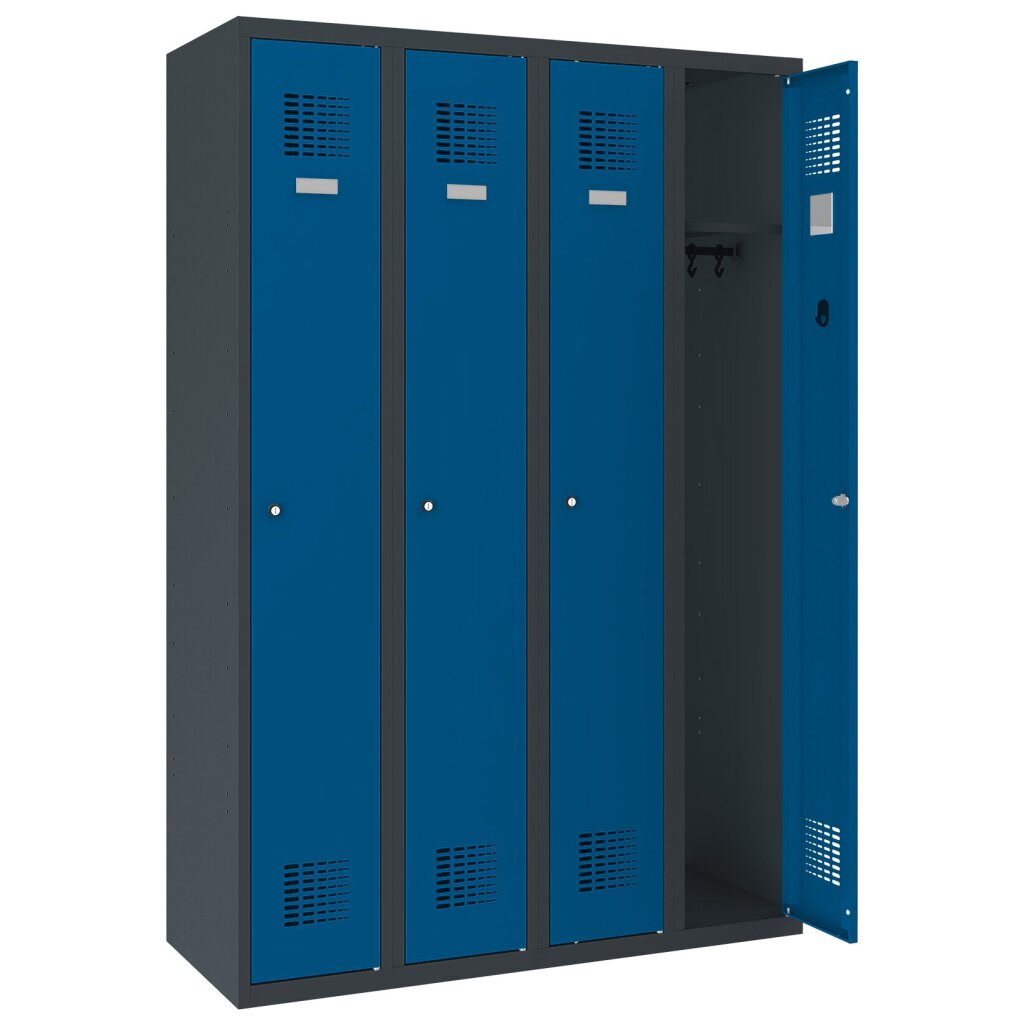 Modernes und überarbeitetes Design der Stahlspinde durch moderne und effektive Lüftungsschlitze sowie verkürzten Sockel für mehr Nutzfläche für die Schrankfächer. Der Sockel reicht dennoch aus um den Schrank bei der Bodenreinigung zu schützen.