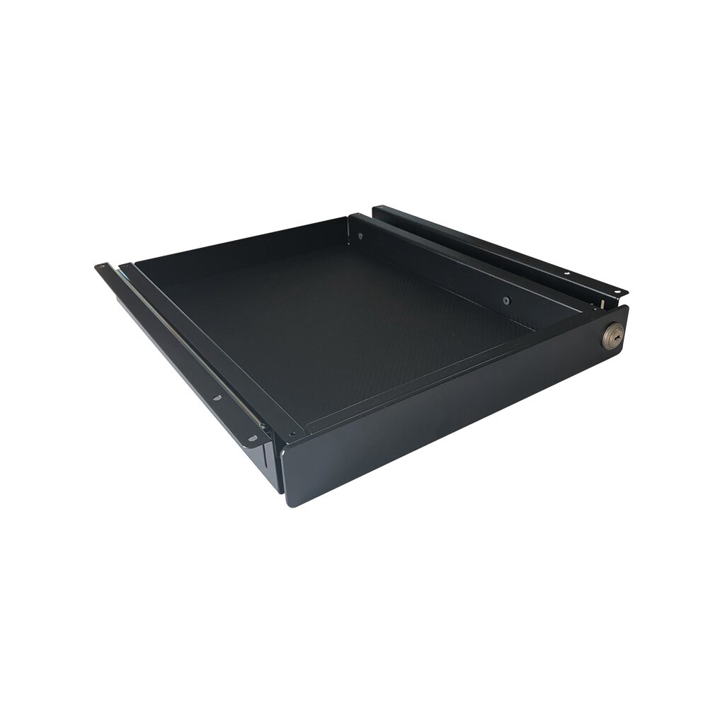 Abschließbare Schublade aus Metall für Tablet oder iPad. Diese wird mit schwarzer Gummimatte und 2 Schlüsseln geliefert.