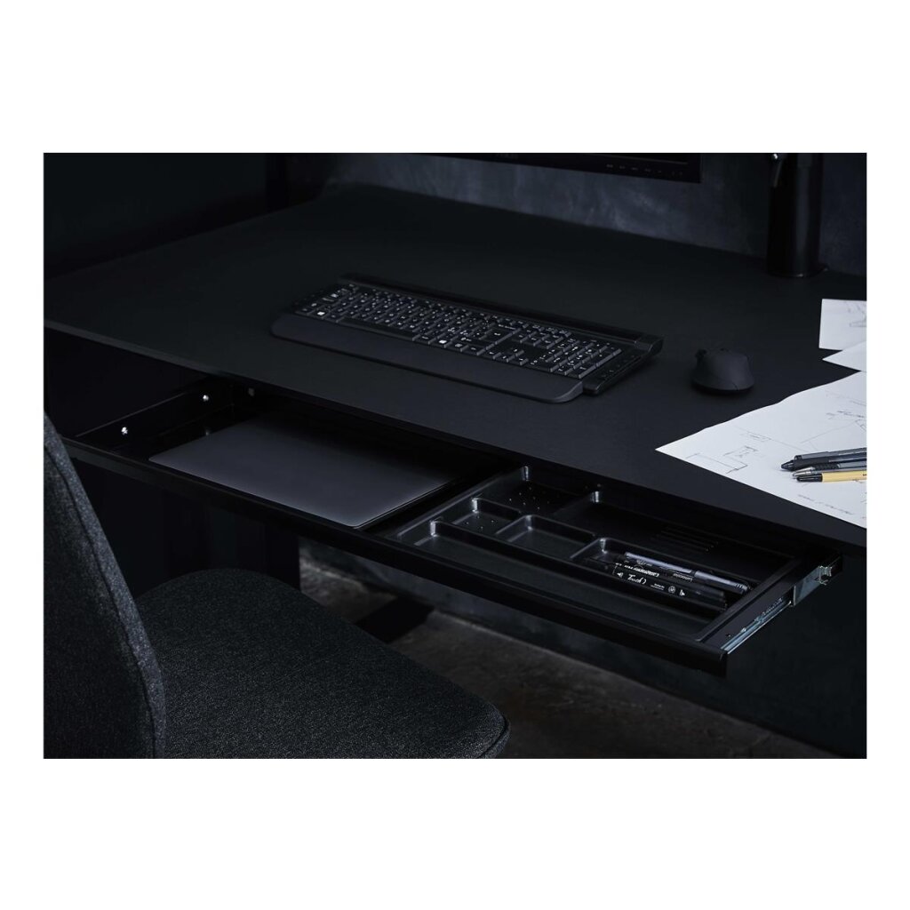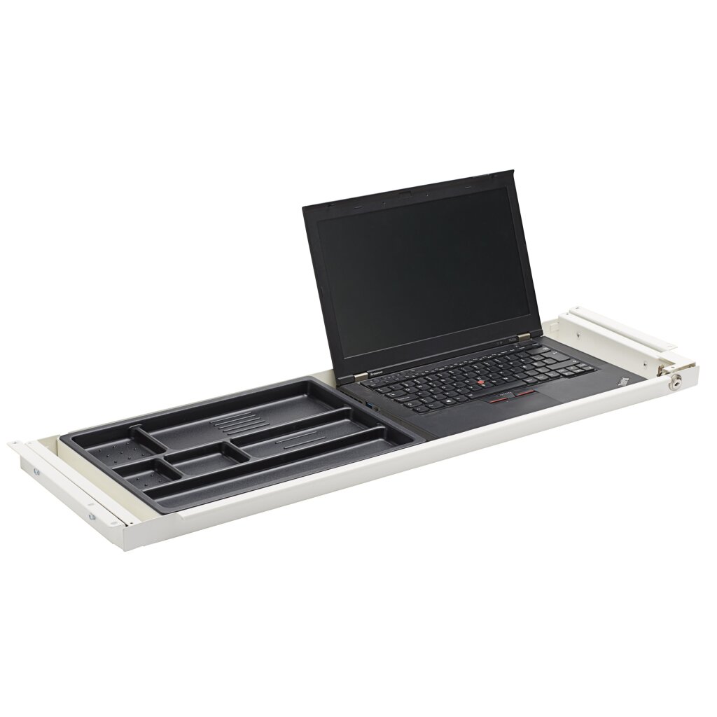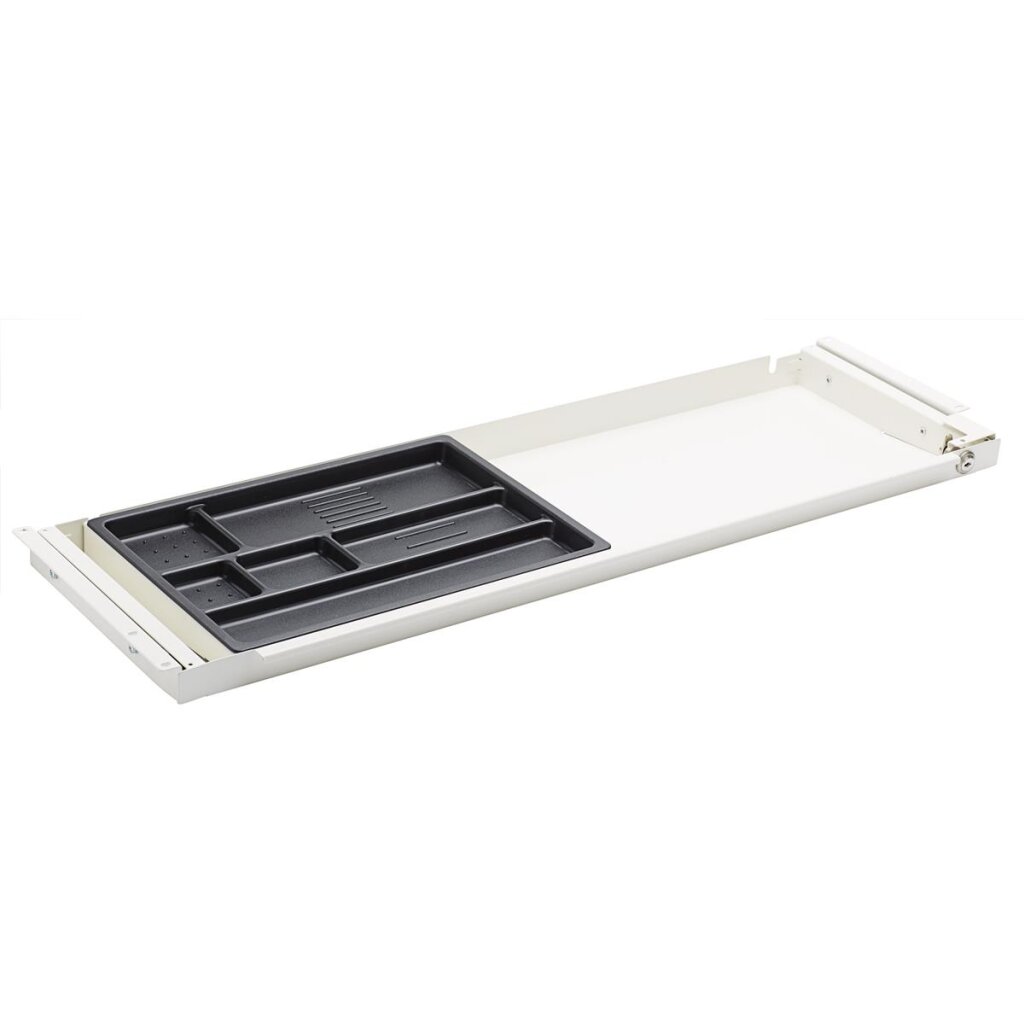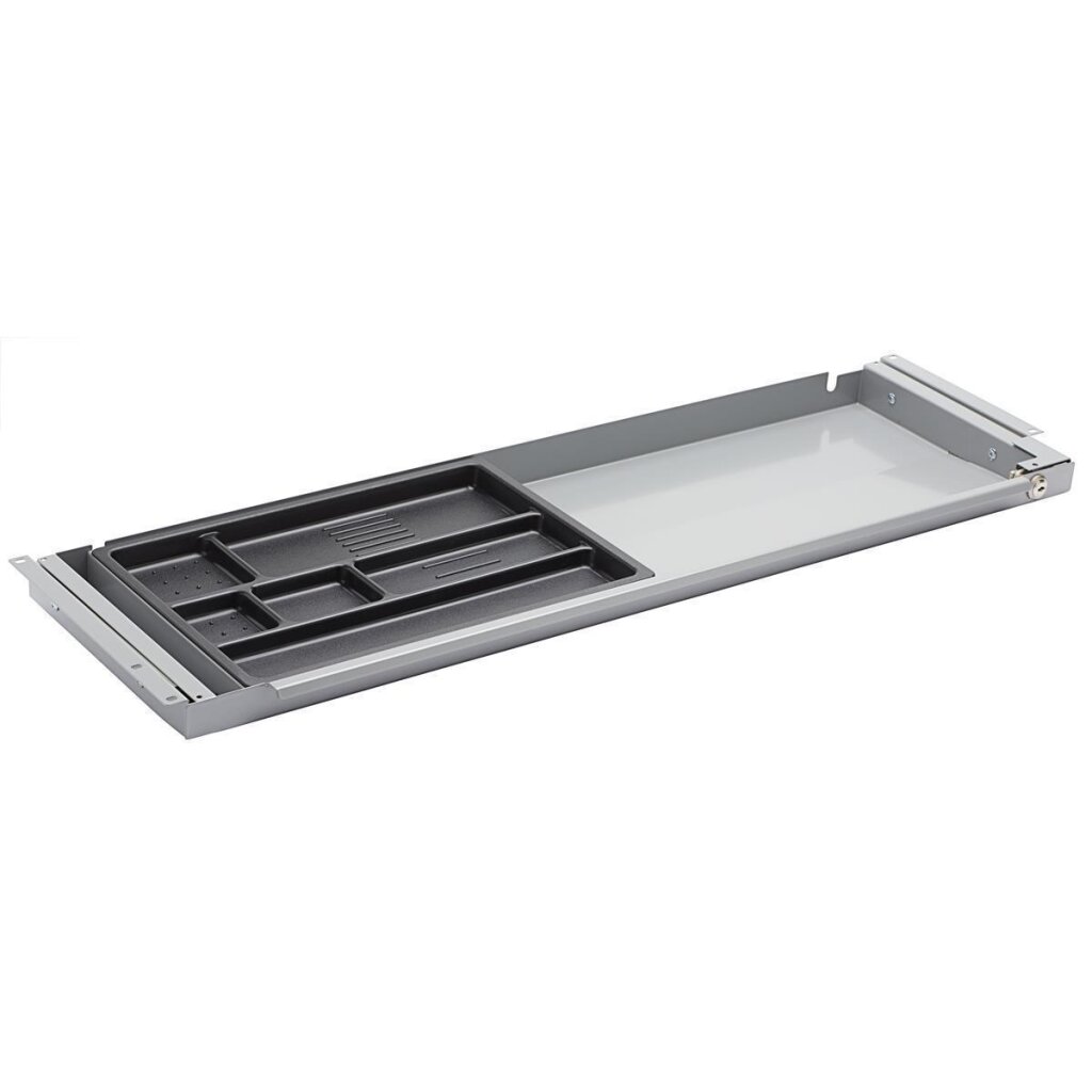 Durch die Tiefe von 26 cm kann diese Schublade aus Metall an fast jedem Schreibtisch montiert werden*. Die Vorderseite der Schublade ist schmal mit einem eleganten und leicht zugänglichen Griff. Der Kunststoffeinsatz lässt sich durch einen Handgriff leicht entfernen. Außenmaß: 88 x 3-5 x 26 cm (B/H/T) Innenmaß: 80 x 3-4 x 24 cm (B/H/T)